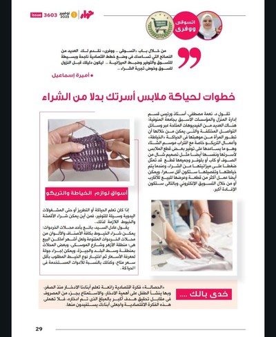 تقول د. نعمة مصطفى، أستاذ ورئيس قسم إدارة المنزل والمؤسسات الأسبق بجامعة المنوفية: هناك العديد من الفيديوهات المتاحة عبر وسائل التواصل المختلفة والتى يمكن من خلالها أن تطور المرأة من موهبتها فى الحياكة "الخياطة" وأعمال التريكو خاصة مع اقتراب موسم الشتاء وهو ما يساعدها على توفير بعض قطع الملابس لأسرتها ونفسها أيضا مثل تصميم شال من الصوف أو كاب أو بلوفر وجميعها قطع غالية الثمن الآن، وعندما يتم خياطتها وتفصيلها ستكون أقل سعرا، ويمكن أيضا عمل أكثر من قطعة وعرضها للبيع للأقارب أو من خلال التسويق الإلكتروني وبالتالى ستكون الإفادة أكبر.