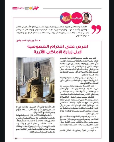- احترام خصوصية الزائرين خاصة السياح الأجانب وعدم تصويرهم دون إذن مسبق منهم، وفى حالة موافقتهم على التقاط بعض الصور معهم لابد مراعاة المسافة اللائقة عند التصوير فلا يصح احتضانهم أو الاقتراب بشكل كبير.